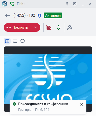 • — переход в окно просмотра видео. При подключении и отключении участников в окне конференции появляются соответствующие уведомления.