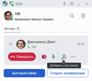 Для создания конференции из вызова в активном вызове нажмите кнопку Добавить участников , откроется окно Создать конференцию, в котором необходимо найти и отметить галочками те контакты, которые требуется пригласить в конференцию. Подтвердите действия с помощью кнопки . Если на момент нажатия на кнопку  не выбран ни один участник, в конференцию попадут текущие участники вызова.