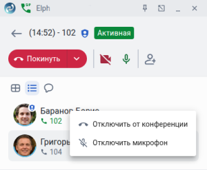 • — переход в окно со списком участников конференции. Администратор нажатием правой кнопкой мыши на карточке участника может управлять его микрофоном, подключать и отключать его от конференции. Вокруг аватара отображается уровень громкости микрофона.