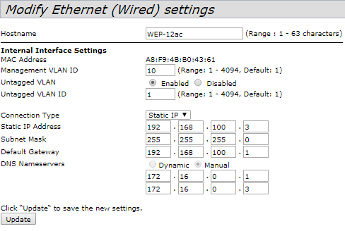 - Static IP Address – укажите IP-адрес WEP-12ac. В данном примере IP-адрес устройства во VLAN 10 – 192.168.100.3;