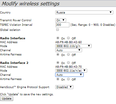 Для вступления в силу новой конфигурации и занесения настроек в энергонезависимую память точки доступа нажмите кнопку «Update».