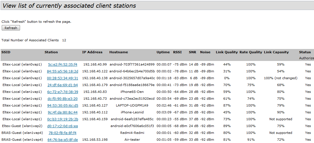- Rate – скорость передачи данных между точкой доступа и определенным клиентом, Мбит/с;