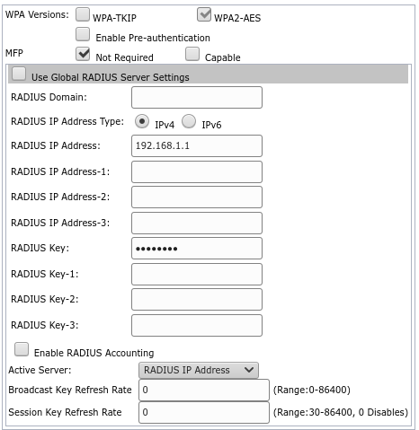 - Централизованная авторизация через RADIUS-сервер (802.1X WPA/WPA2 Enterprise);