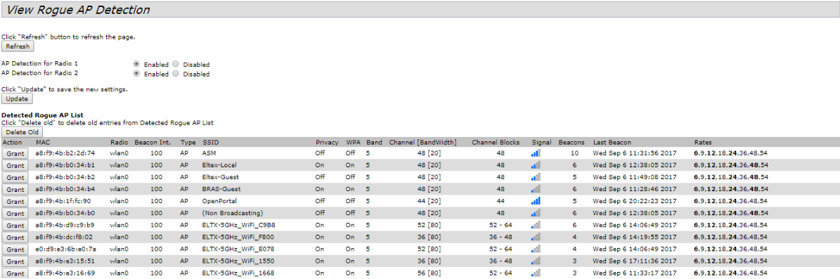 На основании таблицы можно произвести спектральный анализ всей сети и оценить влияние помех на каждую точку доступа. Это позволит оценить правильность расположения точек доступа по территории покрытия и укажет на проблемные места, в которых уровень помех может помешать качественному предоставлению услуг.
