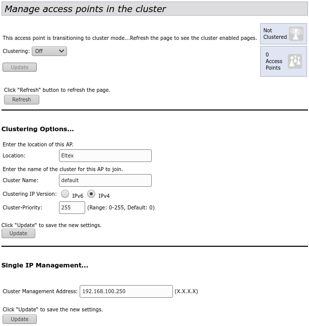 Кластером называется группа устройств, объединенных в рамках одного широковещательного домена, с синхронизируемой конфигурацией и программным обеспечением. По умолчанию режим «Cluster» на точке доступа включен.