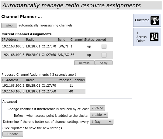 В таблице «Proposed Channel Assignments» приводится информация о возможных значениях канала, на который перейдет радиоинтерфейс точки доступа, если будет запущен пересчет оптимальности выбора канала: