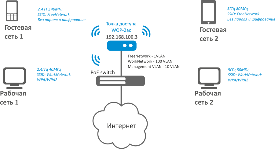 | Гостевая беспроводная сеть, использующая диапазоны 2.4 и 5 ГГц. Не требует авторизации по паролю. Служит для подключения любых пользователей со стандартными беспроводными гаджетами к общей сети, откуда можно выйти, например, в Интернет. | 1 (без VLAN) | FreeNetwork | Отсутствует шифрование и авторизация |