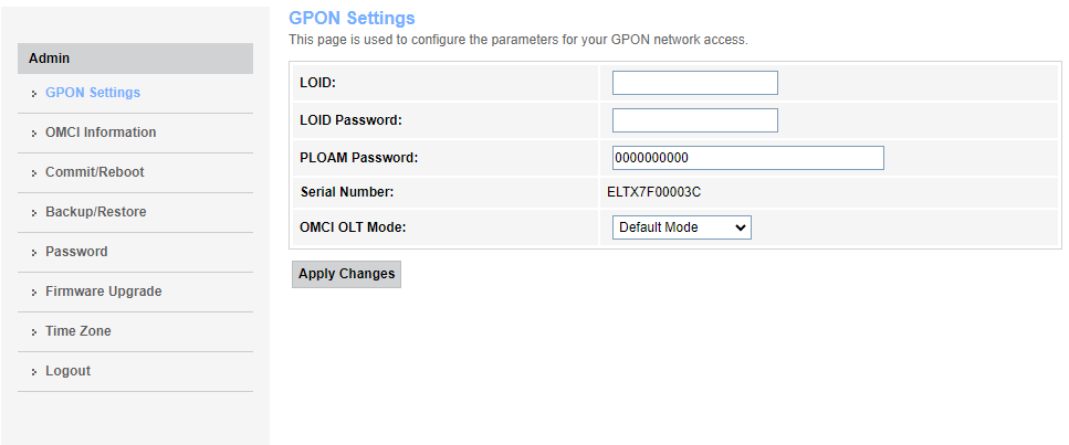 - LOID Password — пароль для доступа с установленным логическим идентификатором (пароль пользователя в сети GPON);