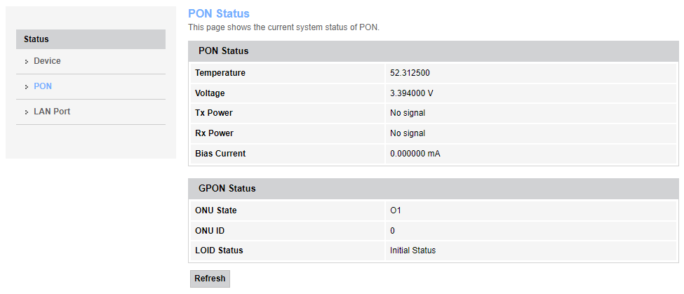 Данное подменю используется для настройки параметров для доступа к GPON-сети.