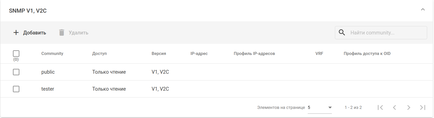 - Community — SNMP V2C community, от имени которого на удаленный сервер будут отправляться уведомления. Значение по умолчанию: "public". Значение должно начинаться с латинских букв (A-Z,a-z) и может содержать цифры и символы за исключением '?', '|' и пробелов.