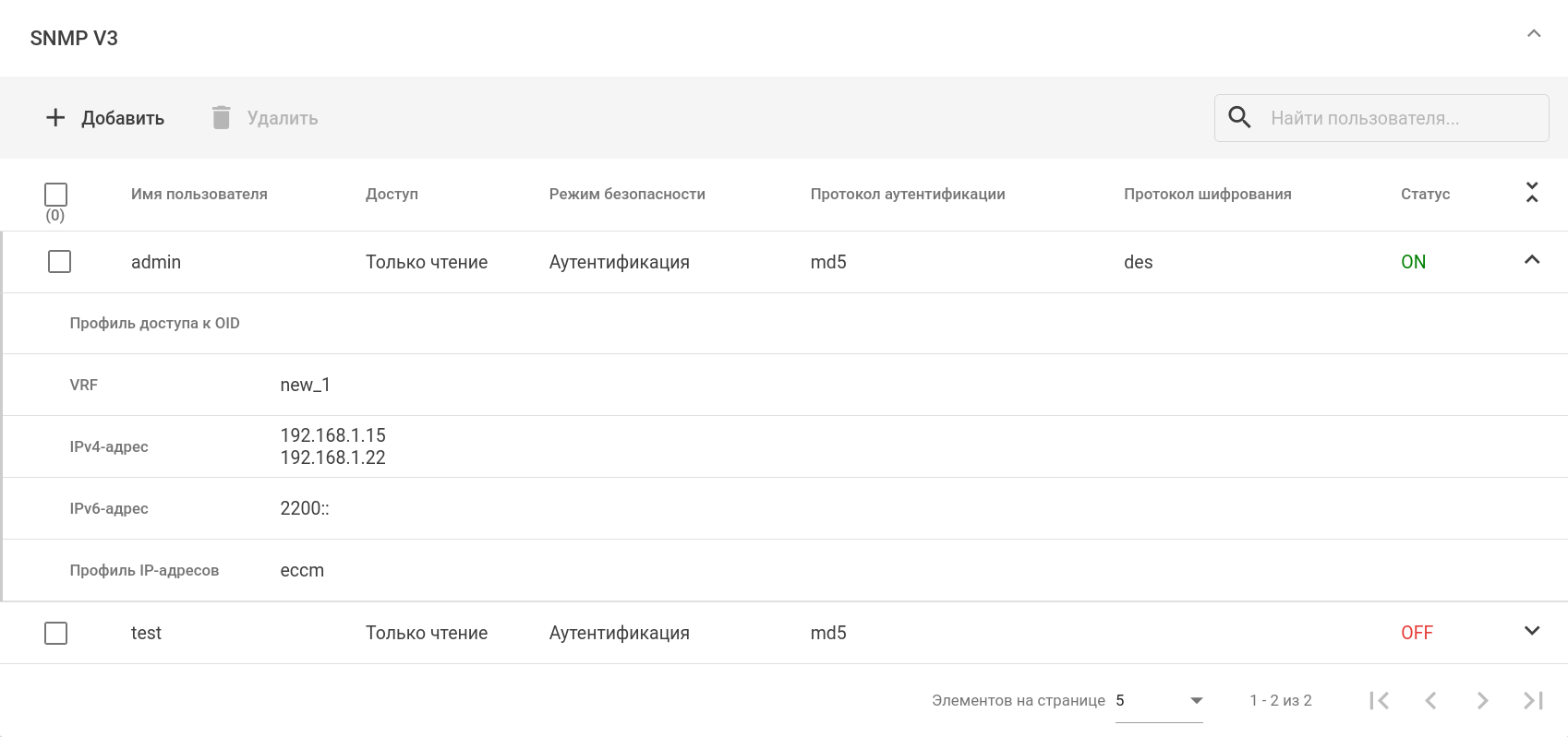 - Пользователь — SNMP V3 пользователь, от имени которого на удаленный сервер будут отправляться уведомления. Пользователь должен быть настроен на устройстве и находиться в состоянии "включен". Поле становится обязательным для заполнения в случае, если в поле "Версия" выставлено значение "V3".