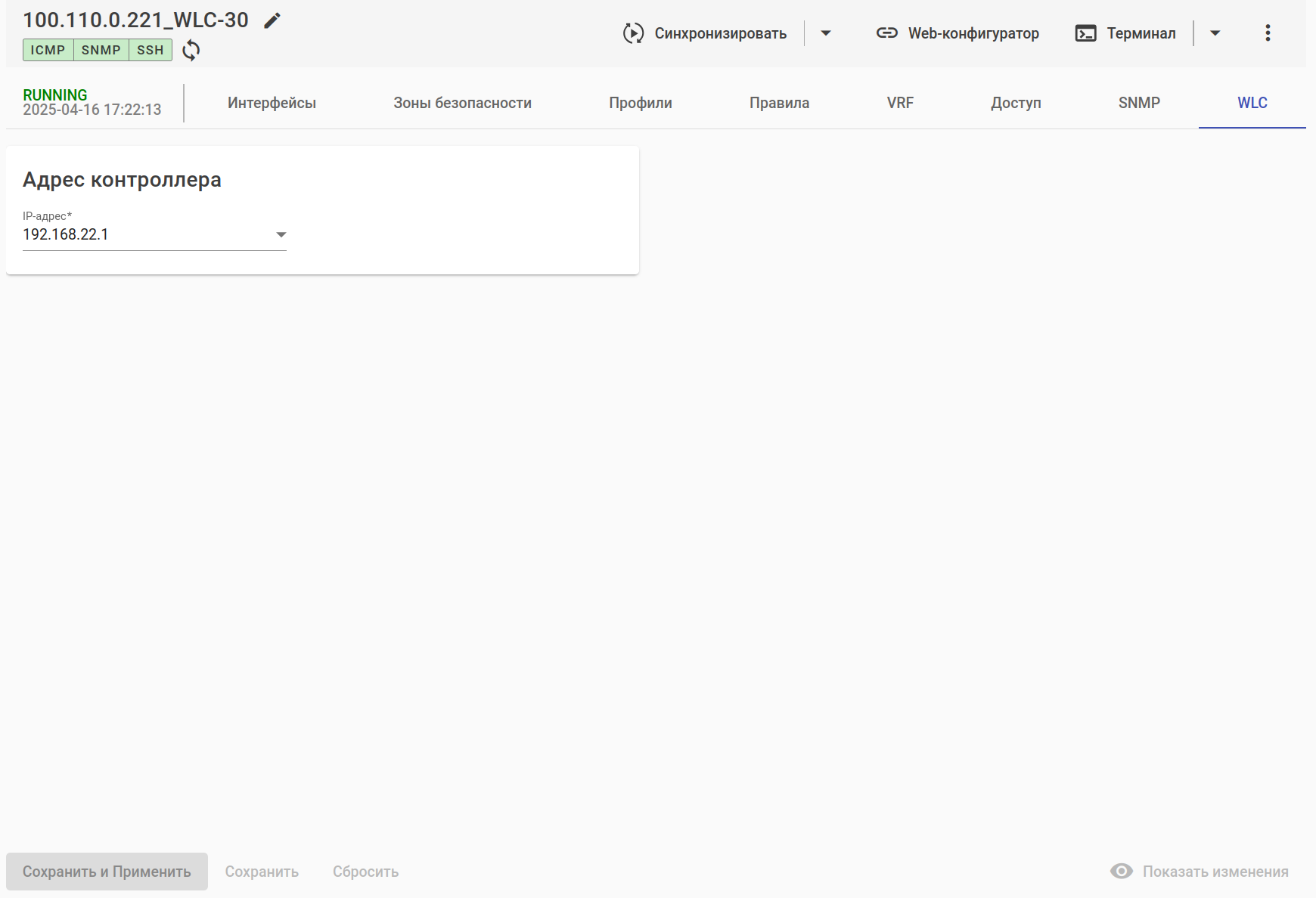 IP-адрес — IP-адрес контроллера, по которому точки доступа будут взаимодействовать с WLC. Выбор значения возможен только из списка адресов, настроенных на интерфейсе устройства.