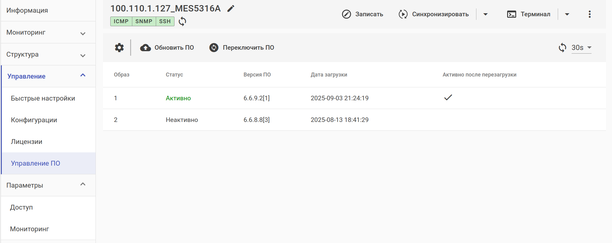 - Активно после перезагрузки — образ ПО, который перейдёт в статус активного ПО при следующей перезагрузке устройства.