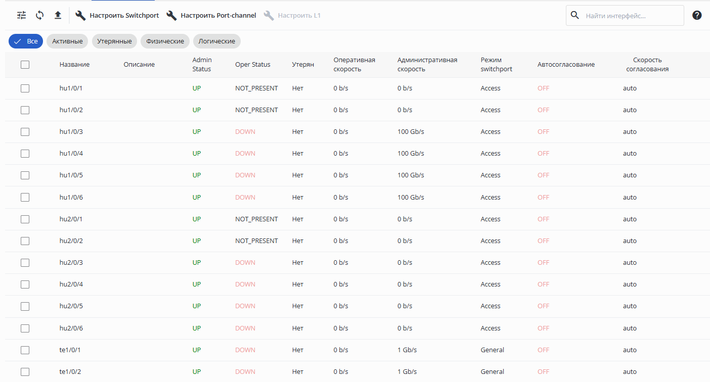 - Иконка раскрытия подтаблицы — отображается только для логических интерфейсов типа port-channel при условии наличия добавленных в них физических интерфейсов.