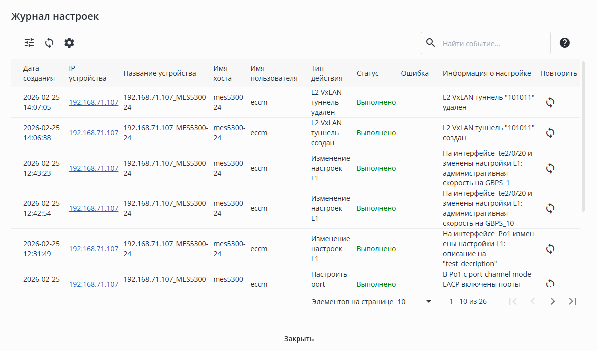- Журнал настроек — кнопка для отображения журнала настроек;