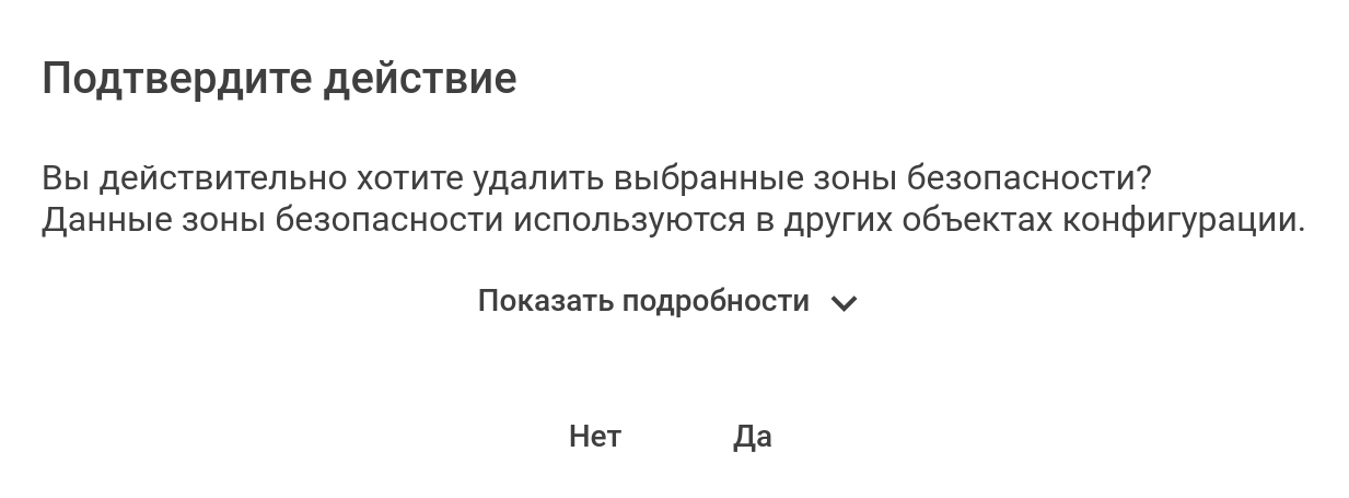 При нажатии на кнопку "Показать подробности" откроется список объектов конфигурации, в которых используются удаляемые профили доступа: