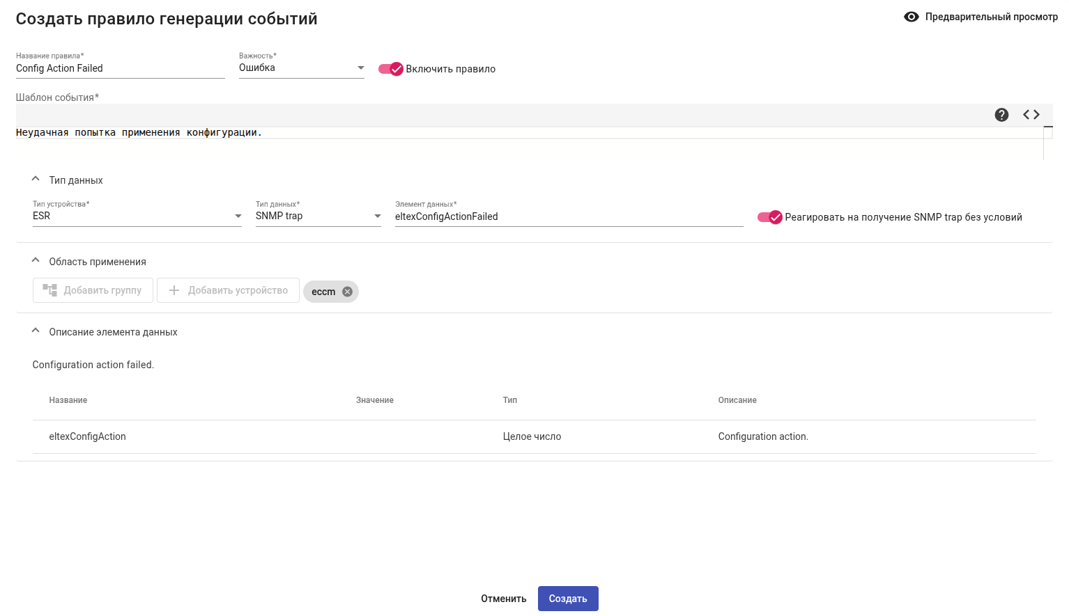 • "Элемент данных" — eltexConfigActionFailed. Это название SNMP trap, ожидаемого системой от устройства, внутри системы;