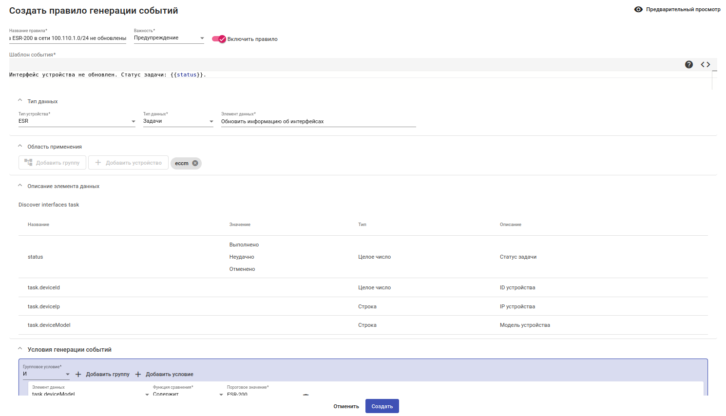 Задача: создать правило генерации события для случая, когда для устройств модели ESR-200 в подсети 100.110.1.0/24 задача "Обновить информацию об интерфейсах" не была завершена. При срабатывании такого правила будет создано системное событие "Интерфейсы устройств ESR-200 в сети 100.110.1.0/24 не обновлены".