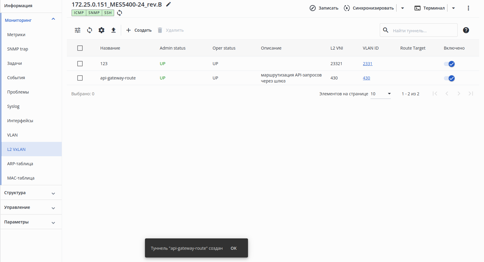 В разделе отображаются L2 VxLAN коммутатора.