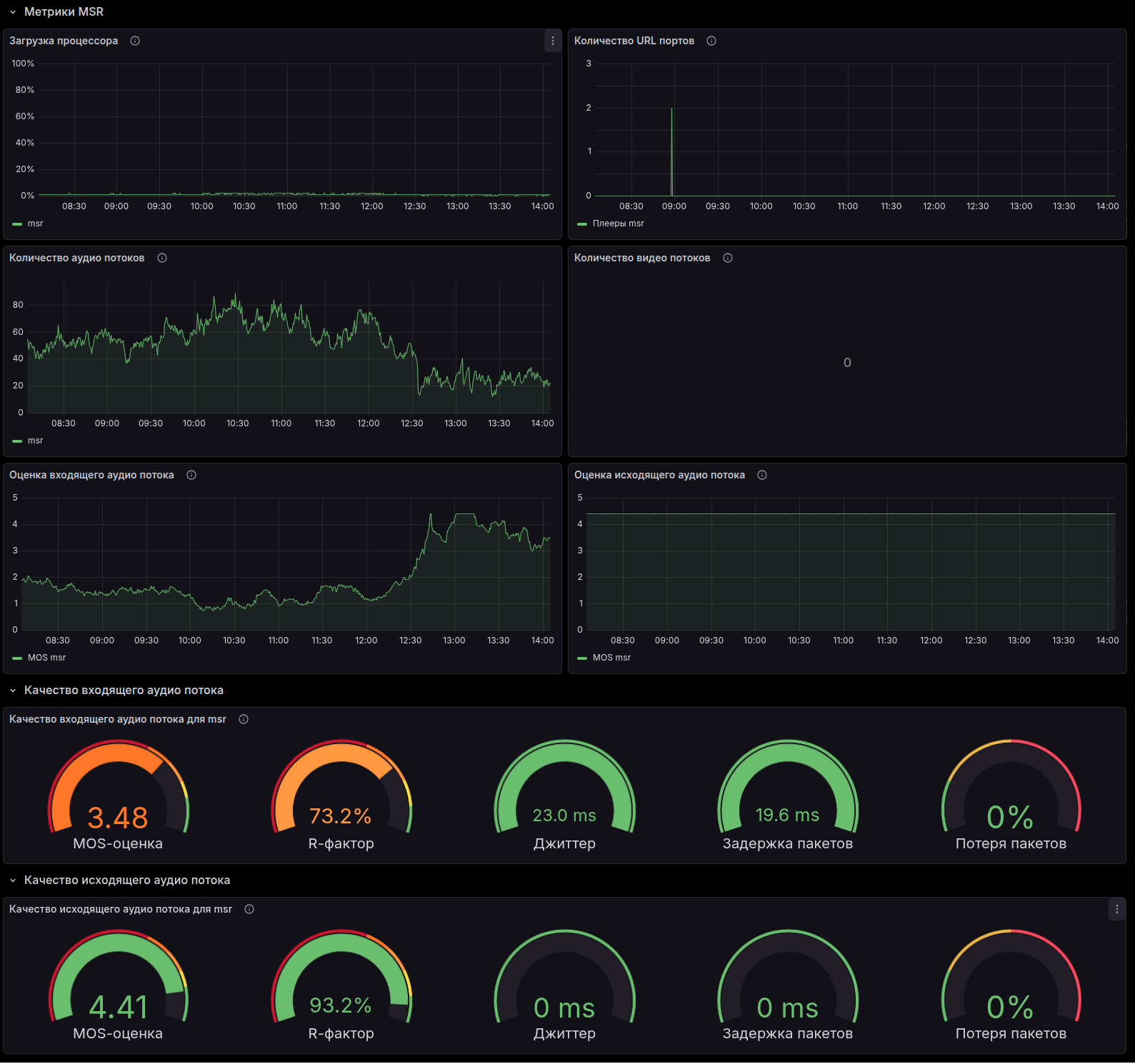 На Информационной панели «Метрики MSR» представлены метрики работы Медиасерверов. Загрузка центральных процессоров, Количество аудио и видео потоков, MOS оценка качества входящего и исходящего аудиопотоков, данные о джиттере, задержке и потере пакетов.