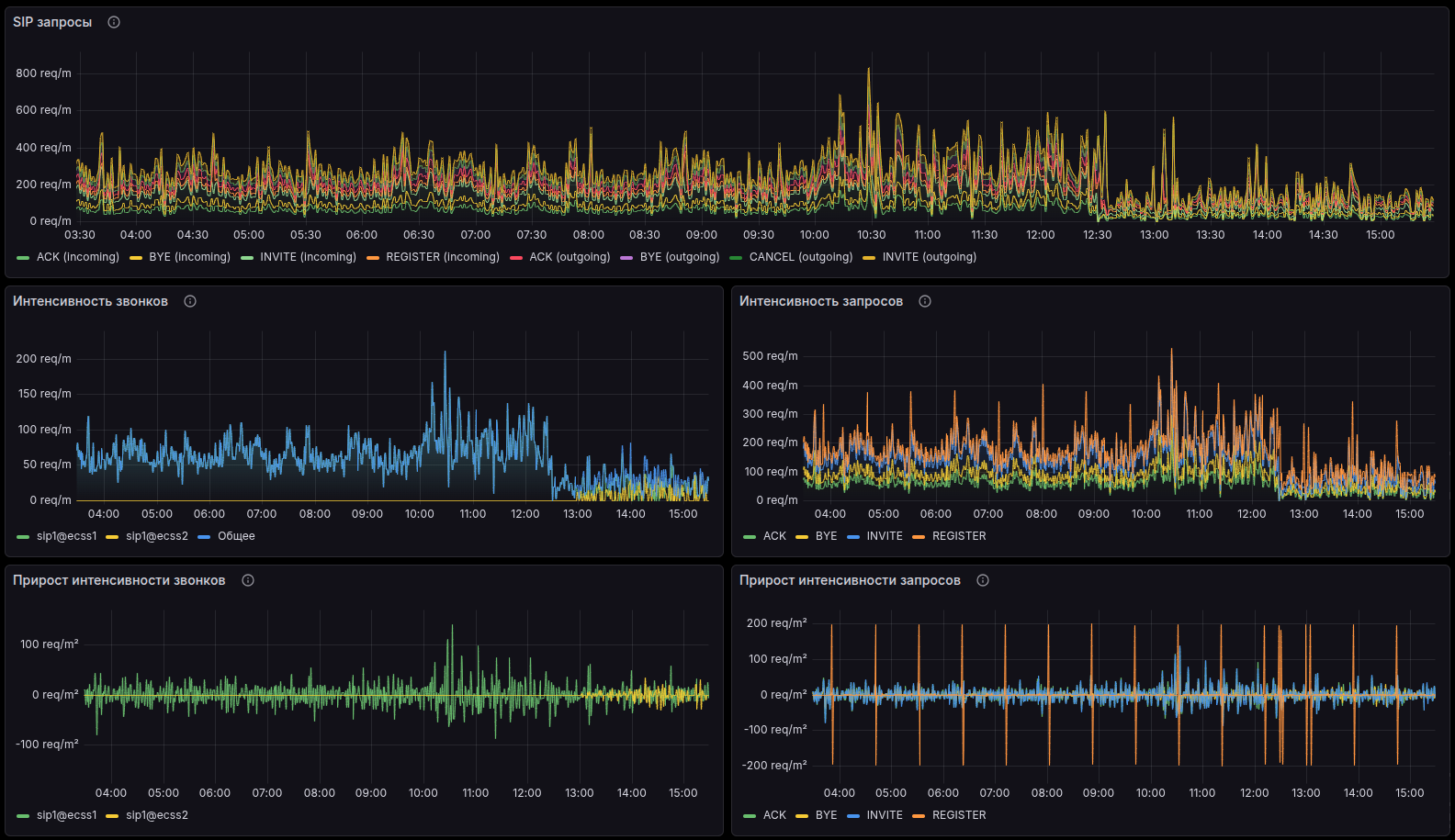 На Информационной панели «Метрики SIP» представлена статистика работы Softswitch по протоколу SIP. Общее количество SIP-запросов, Интенсивность запросов по типам (INVITE, REGISTER, BYE и т. д.), Интенсивность новых вызовов, Динамика изменения интенсивностей.