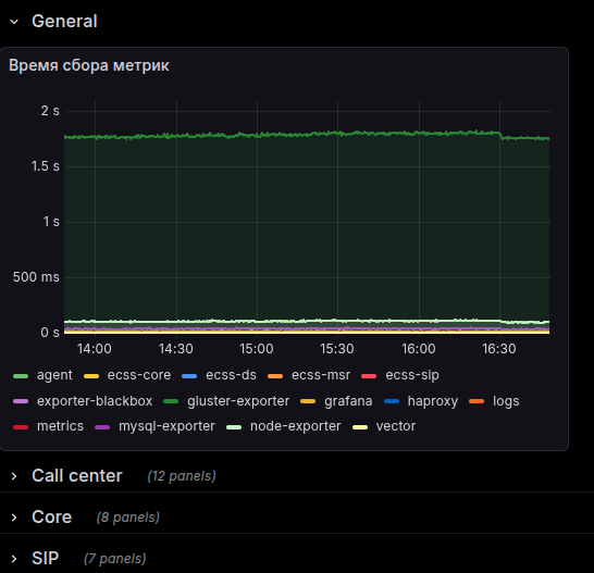 При мониторинге подсистем IP-телефонии не следует забывать о мониторинге ресурсов инфраструктуры. Потребление оперативной памяти, загрузка процессора, свободное место на жестких дисках, общая загруженность системы — все эти параметры отображены в Дашборде «Linux System Dashboard» раздела «General Dashboards – общие дашборды».