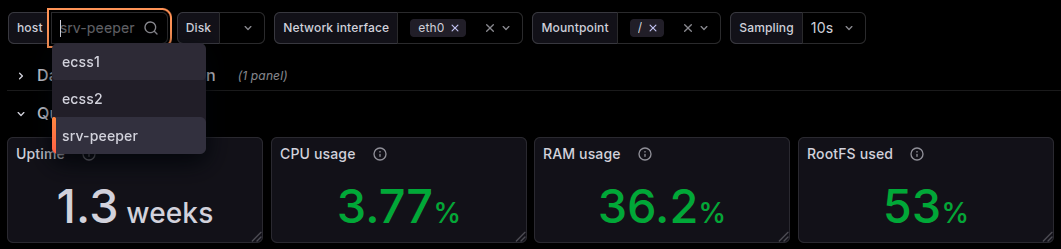 Также не стоит забывать о мониторинге самой системы мониторинга. Закончившееся место на хранилище данных или повышенная загрузка операционной системы системы мониторинга могут помешать отследить критическое отклонение параметров или отправить вовремя уведомление администратору. По умолчанию Peeper мониторит сам себя. Собранные данные можно увидеть на тех же дашбордах, что и данные об операционных системах Softswitch.