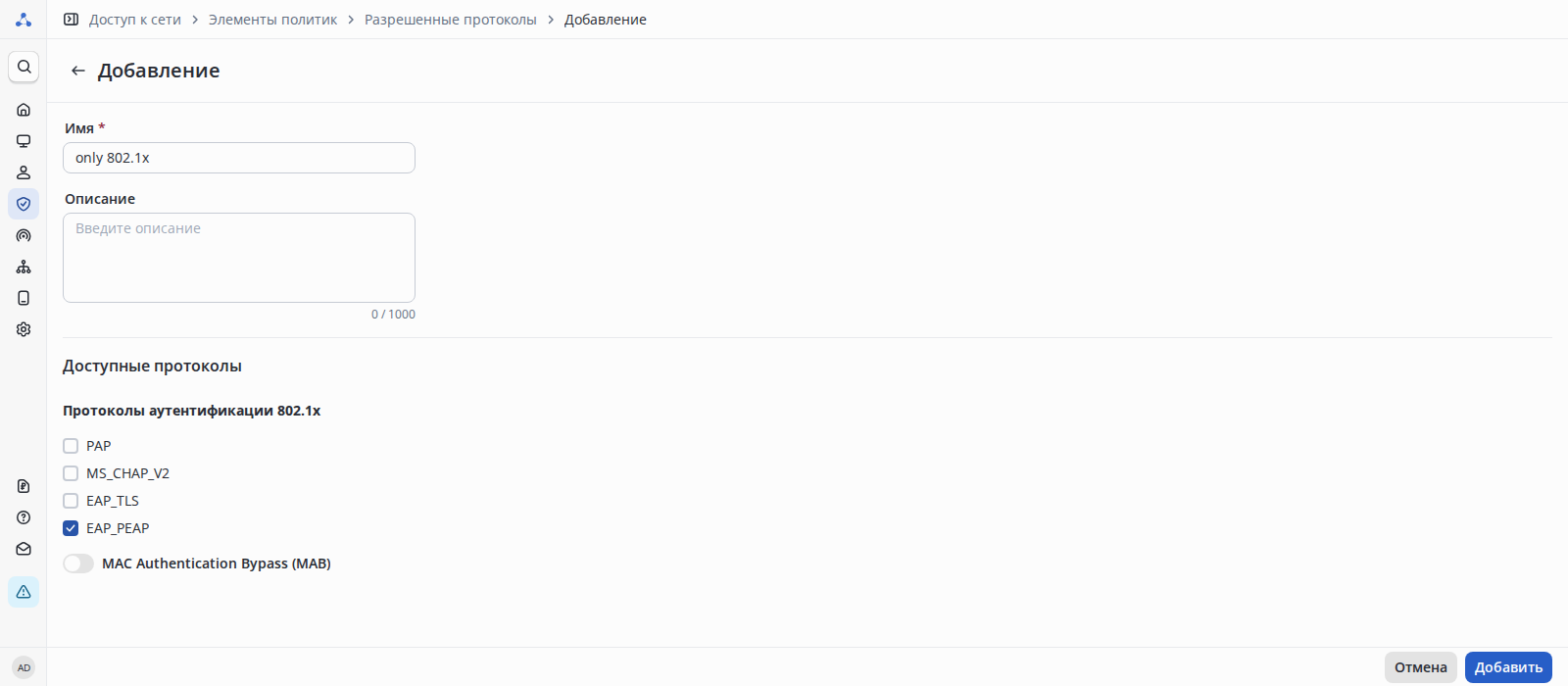 Доступные протоколы: набор протоколов only 802.1x, который включает в себя только протоколы аутентификации 802.1x. Под входное условие попадут только те устройства, у которых включена авторизация по 802.1x.