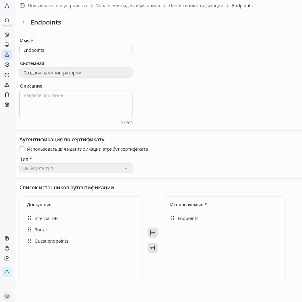- Использовать: созданную вручную цепочку идентификации с источниками идентификации Endpoints.