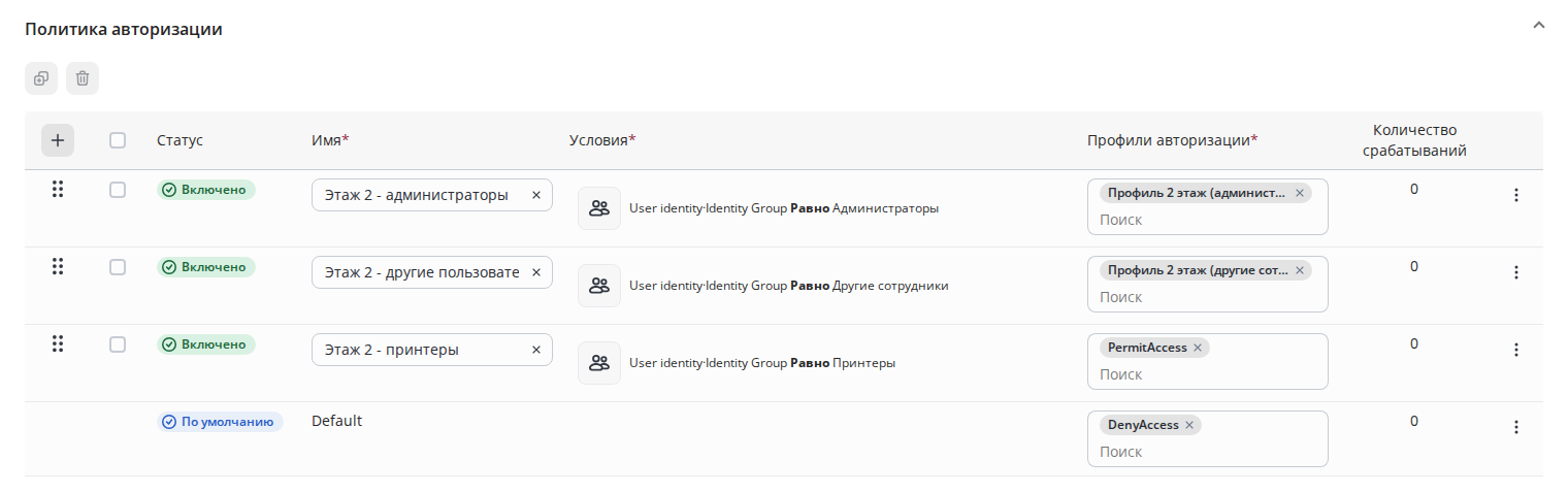 В политиках авторизации выполняется проверка правил сверху вниз, пока не будет найдено совпадающее условие. По умолчанию настроен профиль авторизации DenyAccess, согласно которому в случае, если не будет найдено ни одного правила с совпадающим условием - сетевому устройству будет отправлен ACCESS-REJECT по правилу Default.