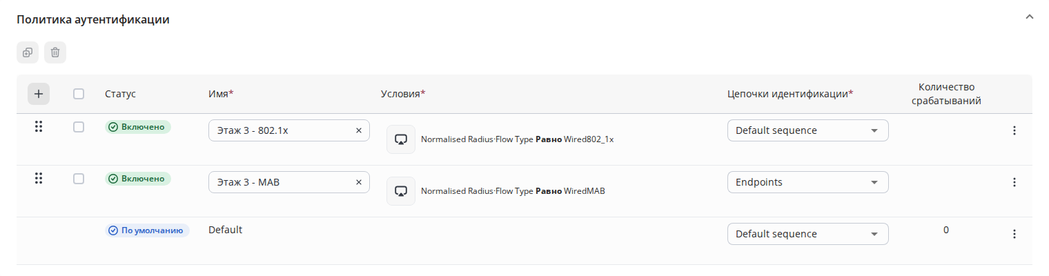 В правилах политики аутентификации выполняется проверка сверху вниз, пока не будет найдено совпадающее условие. Если не будет найдено ни одного правила с совпадающим условием, то будет применено правило Default - по умолчанию сетевому устройству будет отправлен ACCESS-REJECT.