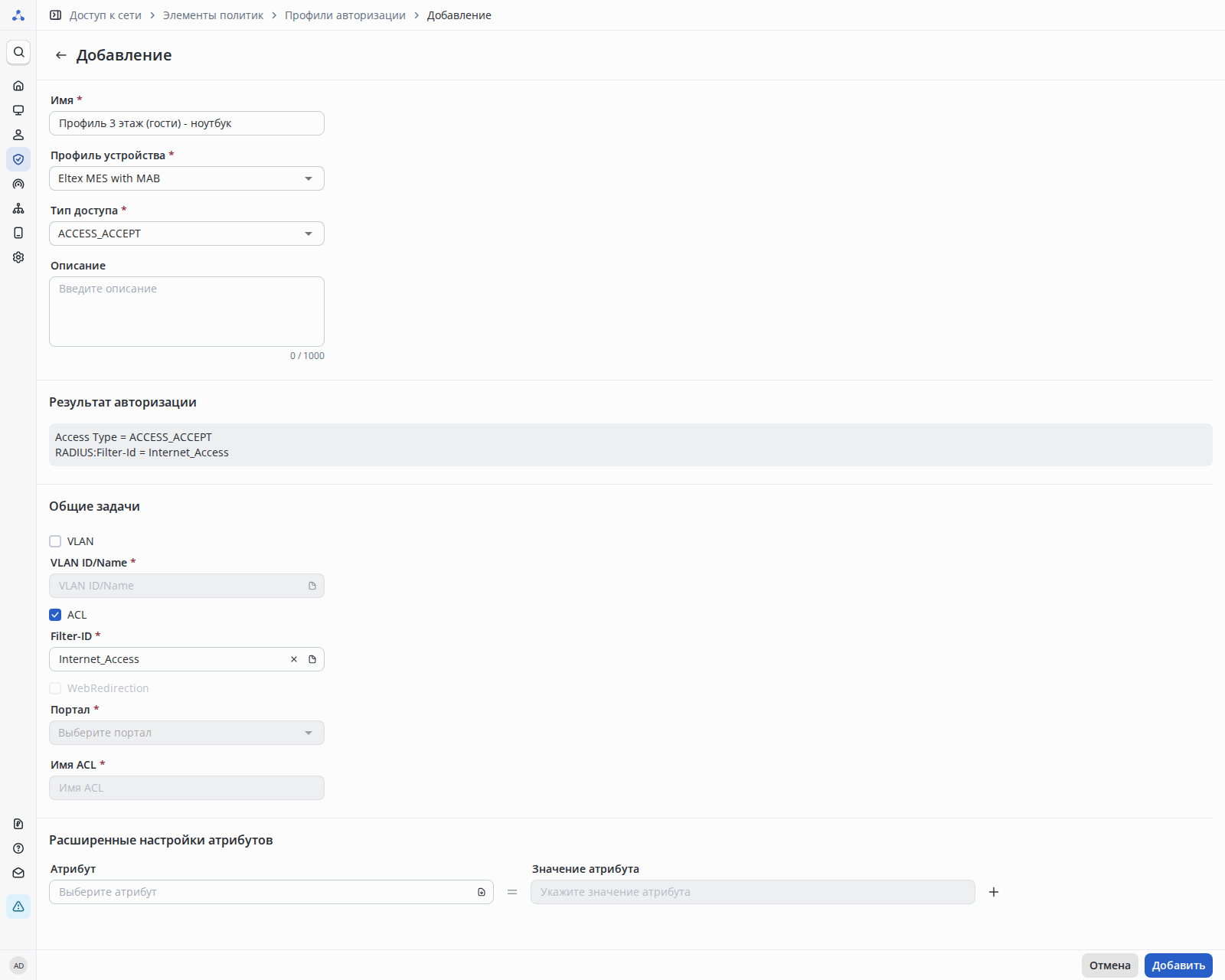 Для прохождения авторизации пользователь должен принадлежать группе Гости. В случае выполнение данного условия устройству будет выдан ACL.