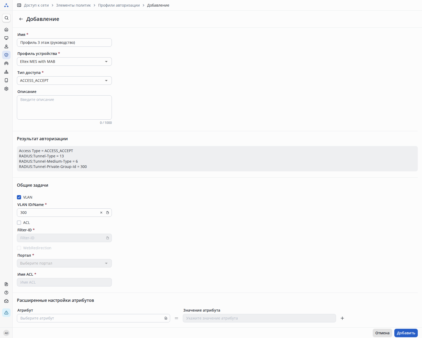 3. Доступ к сети → Элементы политик → Профили авторизации.