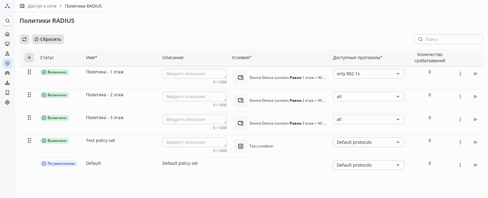 - Настроить 3 набора политик, по одному на каждый коммутатор этажа. Входное логическое условие для набора политик - по местонахождению коммутатора (атрибут Device Location).