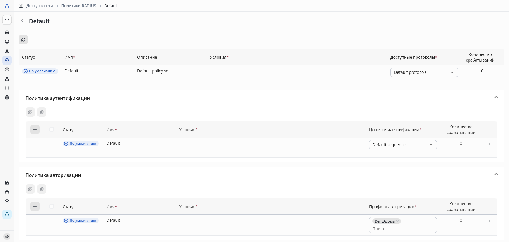 Если набор политик с подходящим условием не будет найден, сетевому устройству будет отправлен ответ в рамках политики по умолчанию Default с набором доступных протоколов Default protocols.