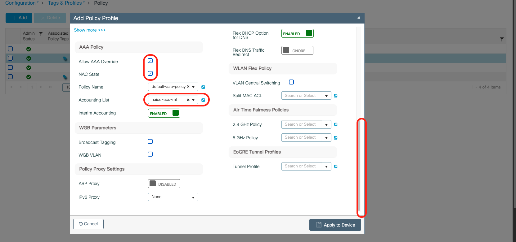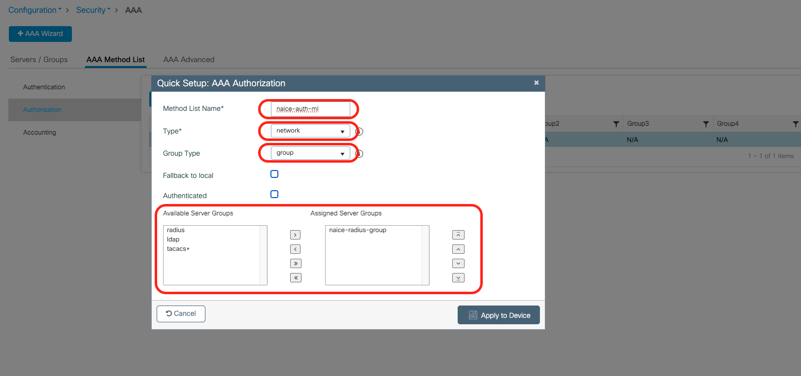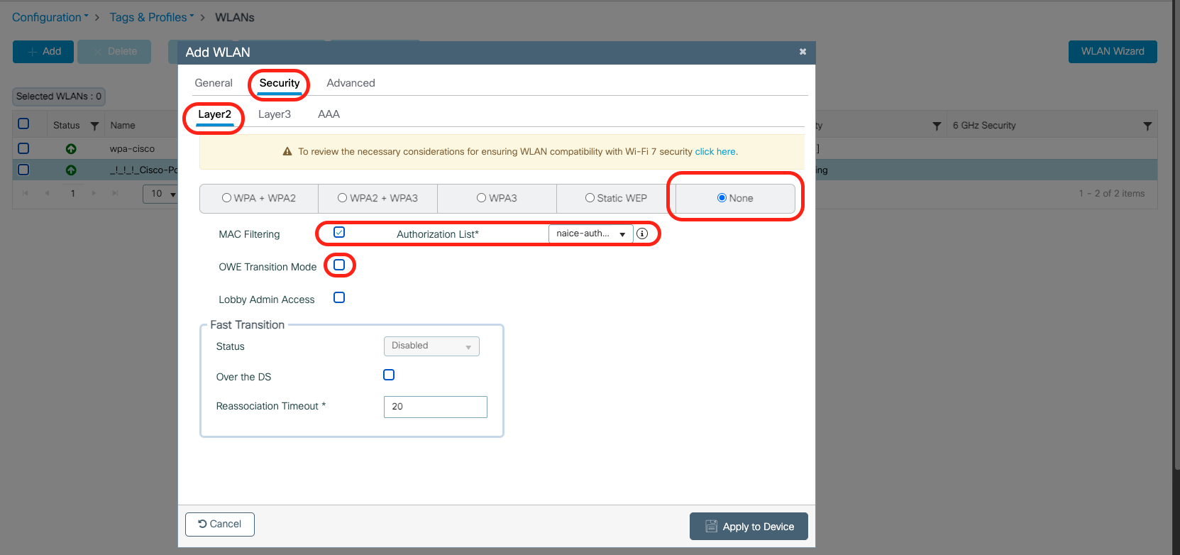 - Поставить флажок MAC Filtering, в появившемся рядом поле Authorization List, выбрать созданный ранее AAA Authorization List (В примере это naice-auth-ml).