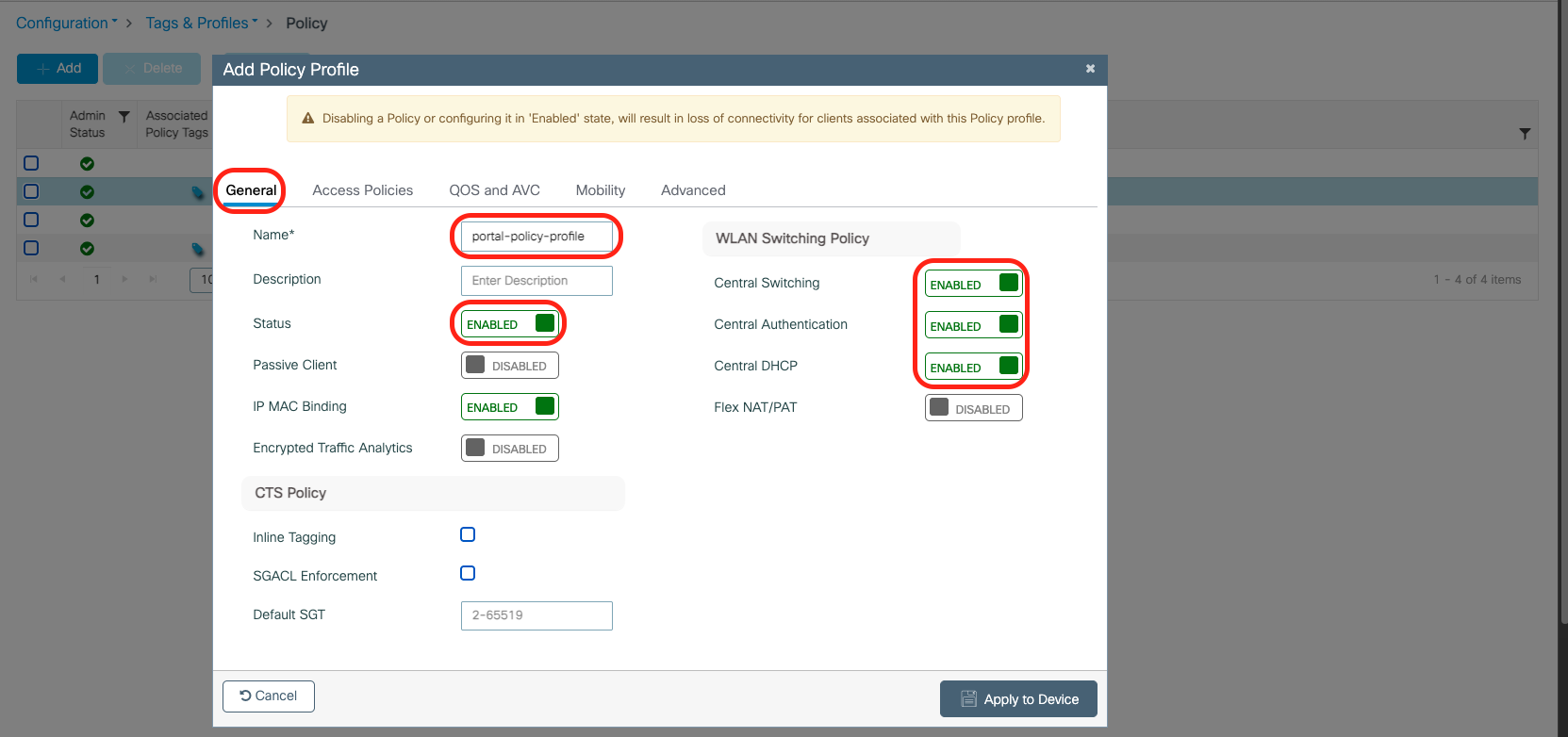 - В поле Name ввести имя профиля (В примере это portal-policy-profile).