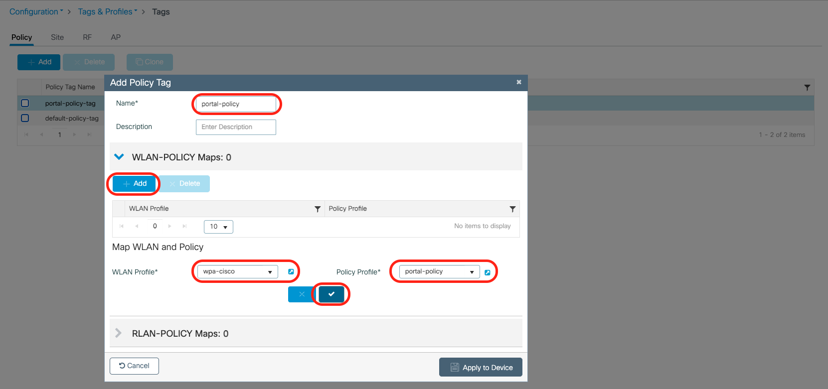 - В открывшемся новом Map WLAN and Policy выбрать созданный для портала WLAN Profile и Policy Profile.