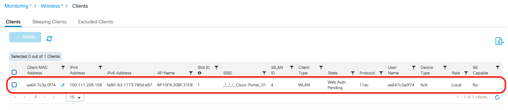 1) После подключения клиентом к беспроводной сети, необходимо на WLC перейти в раздел Monitoring > Clents: