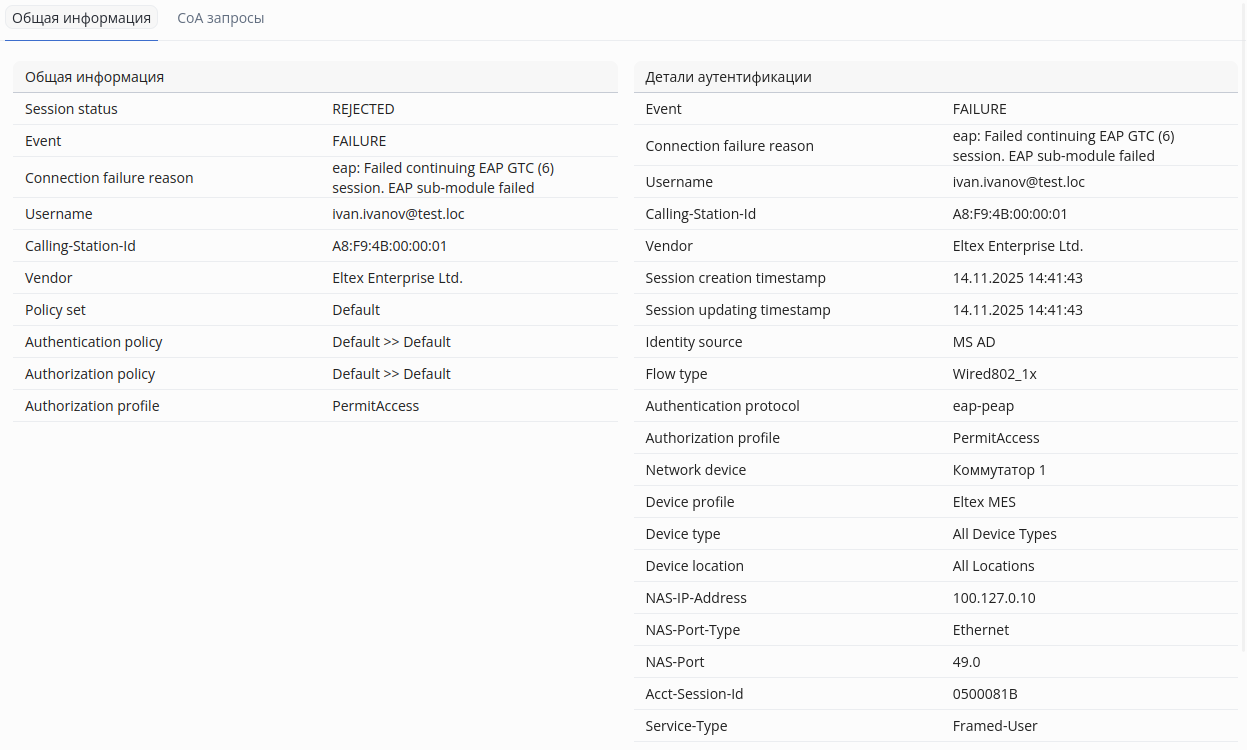 Ошибка Failure как правило возникает при отказе в авторизации согласно профилю авторизации DenyAccess. При этом логин пользователя найден в источнике идентификаций и отображается разделе Мониторинг → RADIUS → Пользовательские сессии: