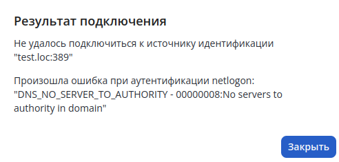 При добавлении источника идентификации типа Active Directory рекомендуется используя кнопку "Проверить связь с сервером" убедиться в возможности корректного взаимодействия до проверки подключения реальным клиентским устройством.