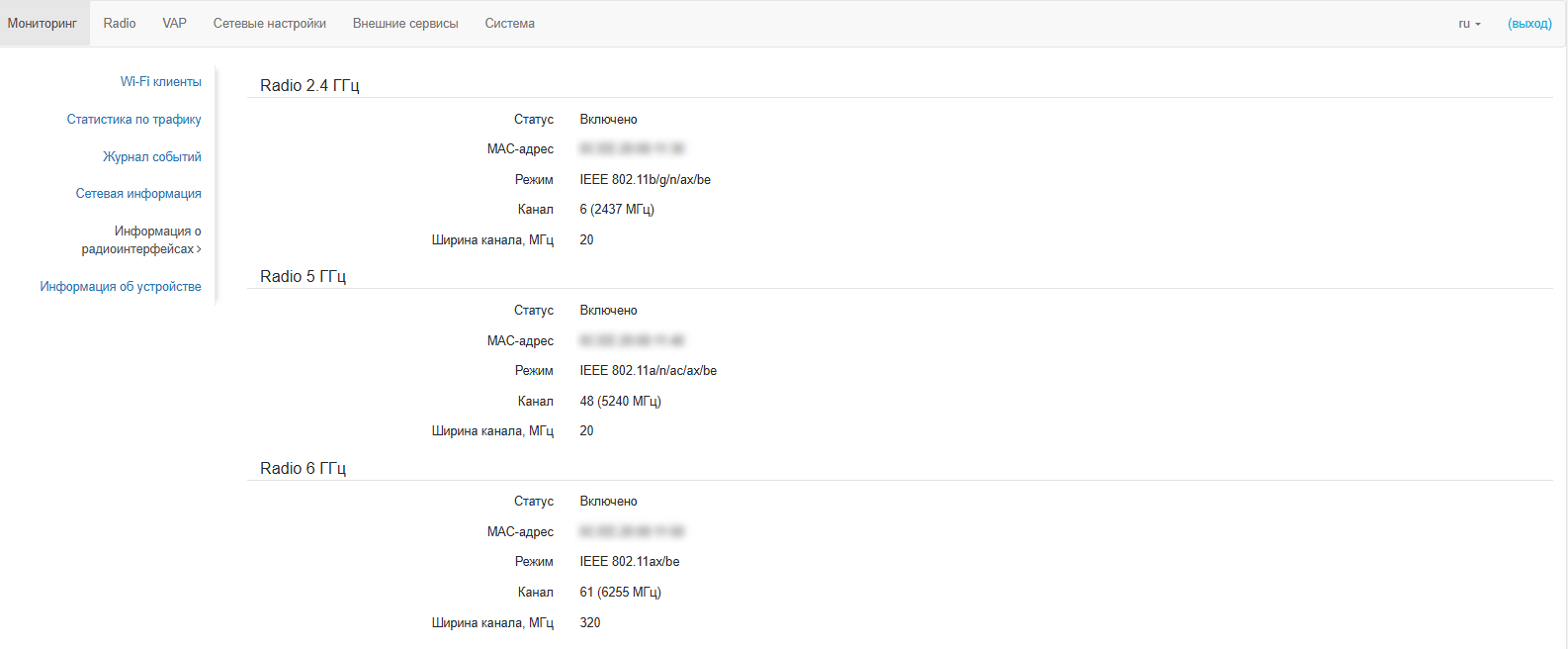 name | wlan0 rfid | 0 status | on band | 2.4 GHz hwaddr | 0C:EE:20:xx:xx:xx tx-power | 16 dBm connection status | AP mode operation mode | vap mode | bgnaxbe noise-1 | -90 dBm noise-2 | -92 dBm channel | 1 frequency | 2412 MHz bandwidth | 20 MHz utilization | 34% thermal | 37 name | wlan1 rfid | 1 status | off band | 5 GHz hwaddr | 0C:EE:20:xx:xx:xx name | wlan2 rfid | 2 status | on band | 6 GHz hwaddr | 0C:EE:20:xx:xx:xx tx-power | 19 dBm connection status | AP mode operation mode | vap mode | axbe noise-1 | -92 dBm noise-2 | -92 dBm channel | 1 frequency | 5955 MHz bandwidth | 20 MHz utilization | 0% thermal | 40
