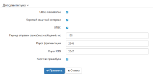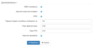 WEP-550K(config):/interface/wlan0/wlan/radio# obss-coex true (включение режима автоматической смены ширины канала с 40 МГц на 20 МГц при загруженном радиоэфире. Для отключения введите false)