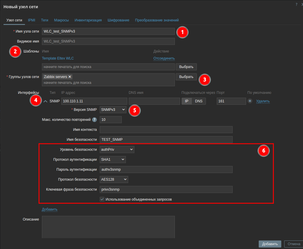 В ZABBIX при использовании SNMPv3 можно гибко настраивать уровень безопасности в зависимости от требований к защите данных: