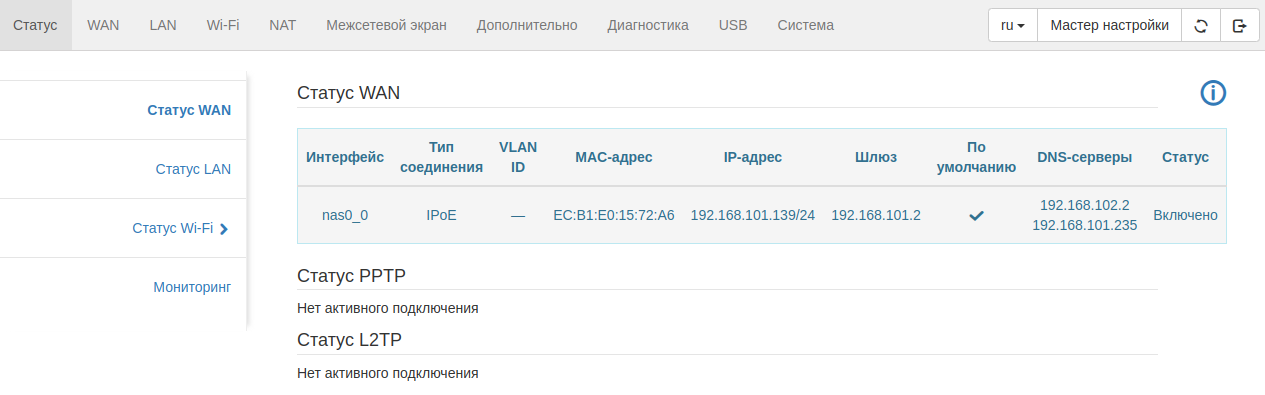 - Далее необходимо подключиться под пользователем admin, пароль по умолчанию password. При первом подключении будет предложено сменить пароль, можно осуществить смену. Далее автоматически откроется страница «Статус WAN», на которой будет отображаться статус сетевого соединения Интернет. По умолчанию на устройстве создан IPoE-интерфейс nas0_0 с типом подключения DHCP. При корректной настройке вышестоящего оборудования реквизиты будут получены из конфигурации устройства по умолчанию.