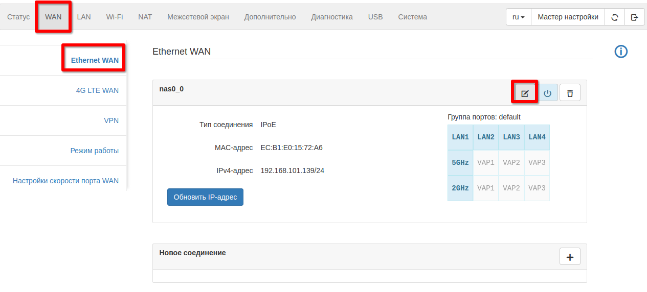 - В конфигурации по умолчанию будет работать только сервис internet. Для работы IPTV необходимо включить IGMP proxy на WAN-интерфейсе. Для этого необходимо выбрать вкладку «WAN» → раздел «Ethernet WAN» и нажать на иконку редактирования WAN-интерфейса nas0_0.