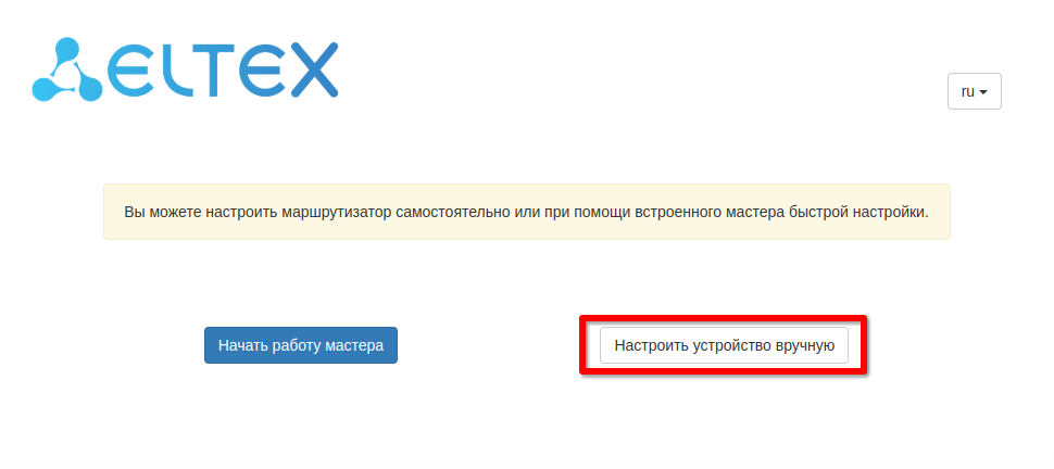 - Подключение к web-интерфейсу ONT осуществляется со стороны LAN по адресу 192.168.1.1. Рассмотрим ручную настройку устройства, выбрав соответствующий пункт при подключении к web.