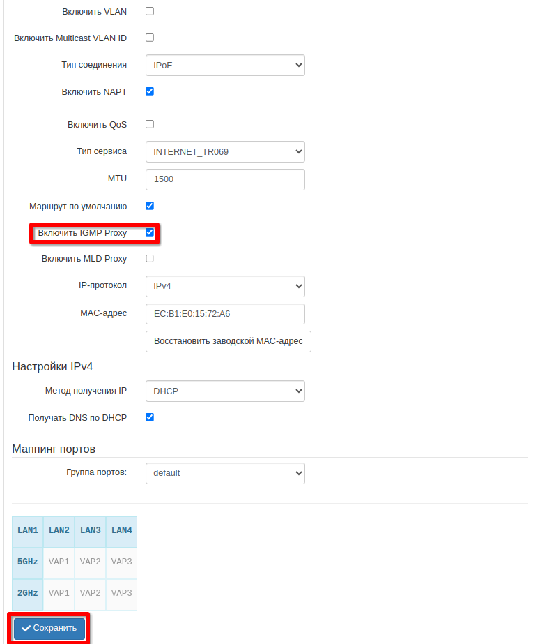 - В открывшемся окне необходимо установить флаг напротив параметра Включить IGMP Proxy и сохранить настройки.