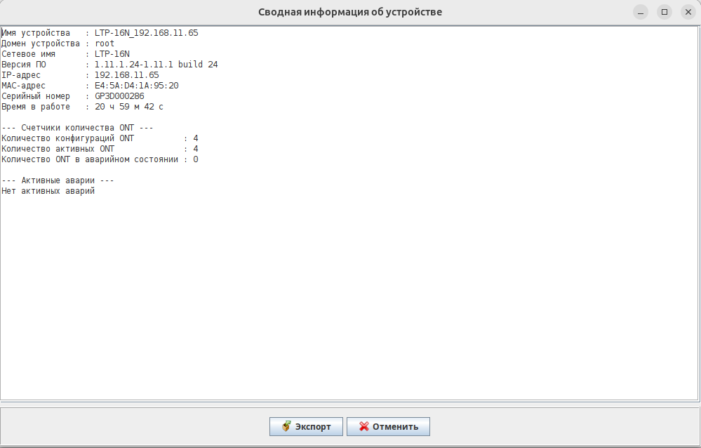 Во вкладке отображаются общие данные, полученные от устройства. Информация доступна только в режиме чтения.