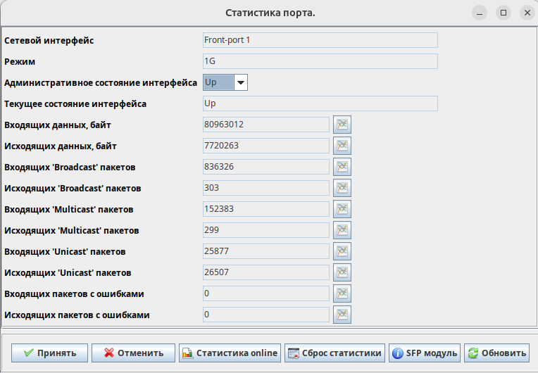 Кнопки статуса портов являются активными элементами, по нажатию осуществляется переход к окну информации об интерфейсах, где также возможно изменить административный статус порта.